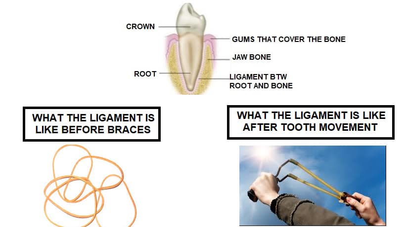 There are rubber band-like ligaments that connect a tooth’s root to the bone and connects adjacent roots to each other. These ligaments play a scientific role in tooth movement. THEY ARE ALSO A REASON WHY WE NEED TO WEAR RETAINERS WHEN BRACES ARE TAKEN OFF…Just like a pulled rubber band that can be shot across a room, a pulled ligament has memory that will try to pull a tooth back to it’s original position. Retainers need to be worn to give these ligaments time to get use to their new position!!!